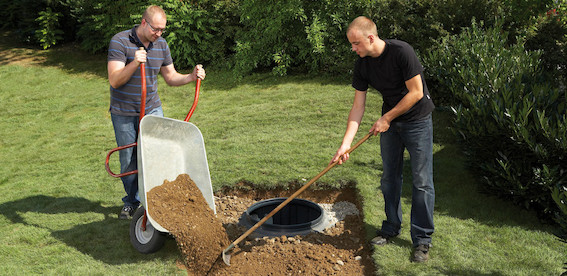 Graaf een kuil op de gewenste plaats en laat de tank er voorzichtig in zakken. Sluit de nodig leidingen aan.